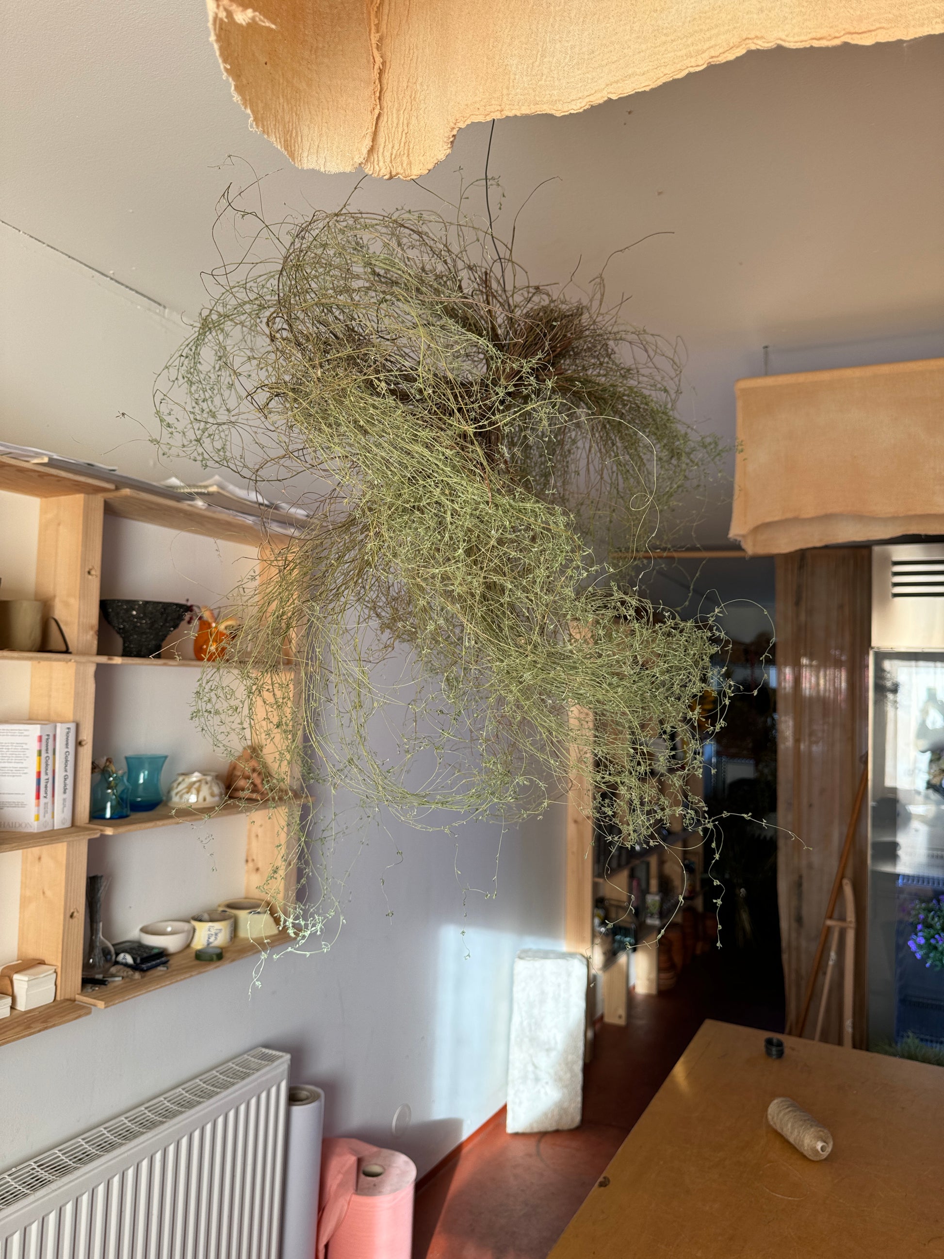 En skulptur av Timjan och ståltråd. Vitalt växtmaterial som torkar i rörelsen.